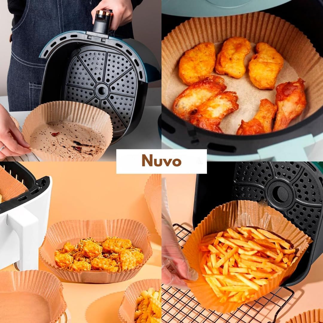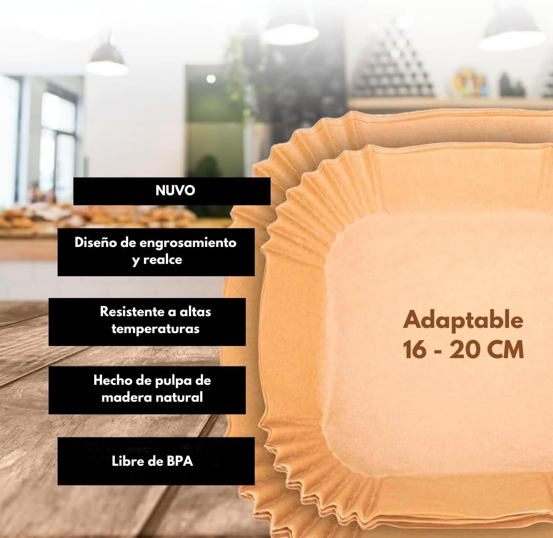 Papel para Freidora de Aire 100 Piezas (16-20 cm) – Antiadherente, Desechable, Libre de BPA – Resistente a Aceite, Ideal para Hornear – Incluye Ebook de Recetas